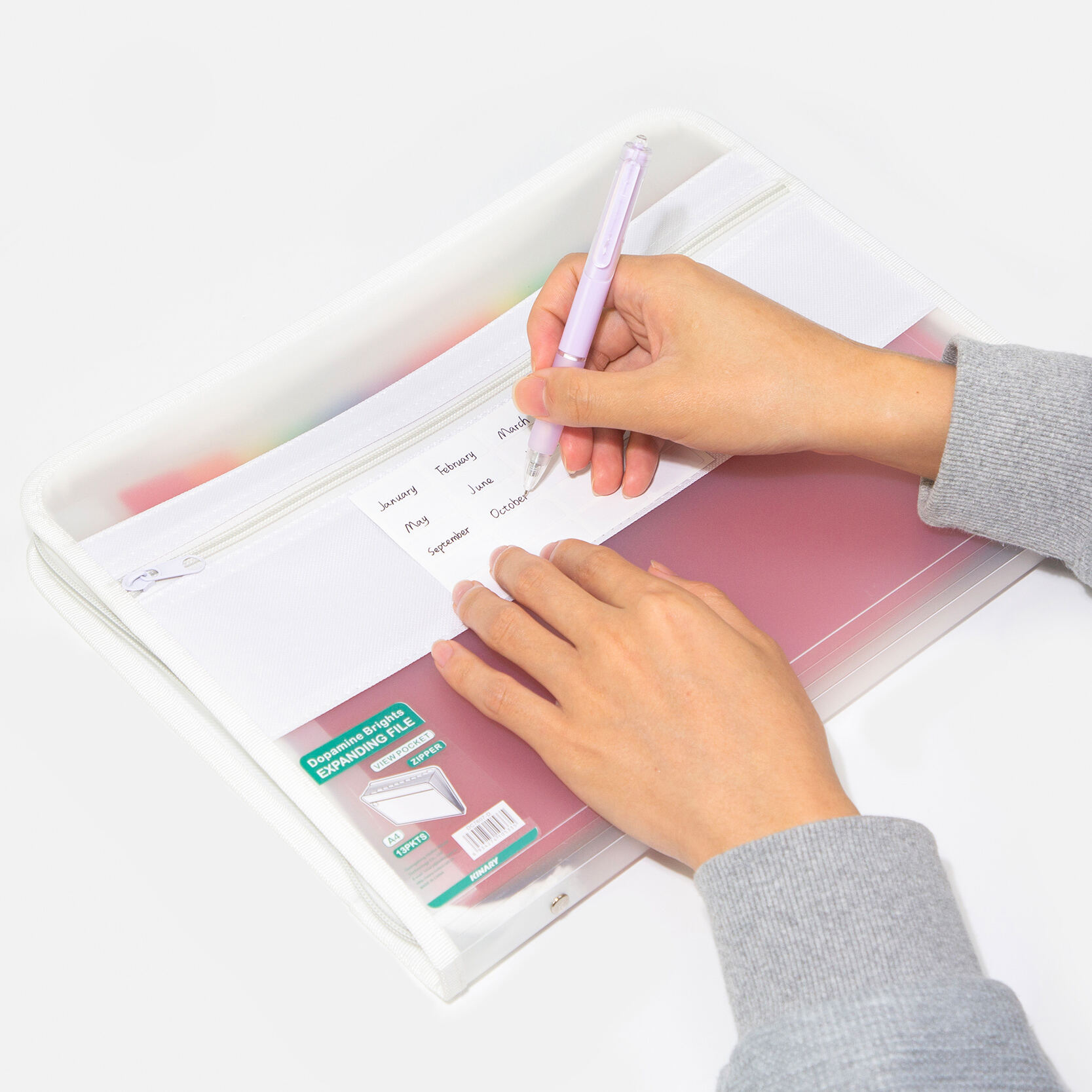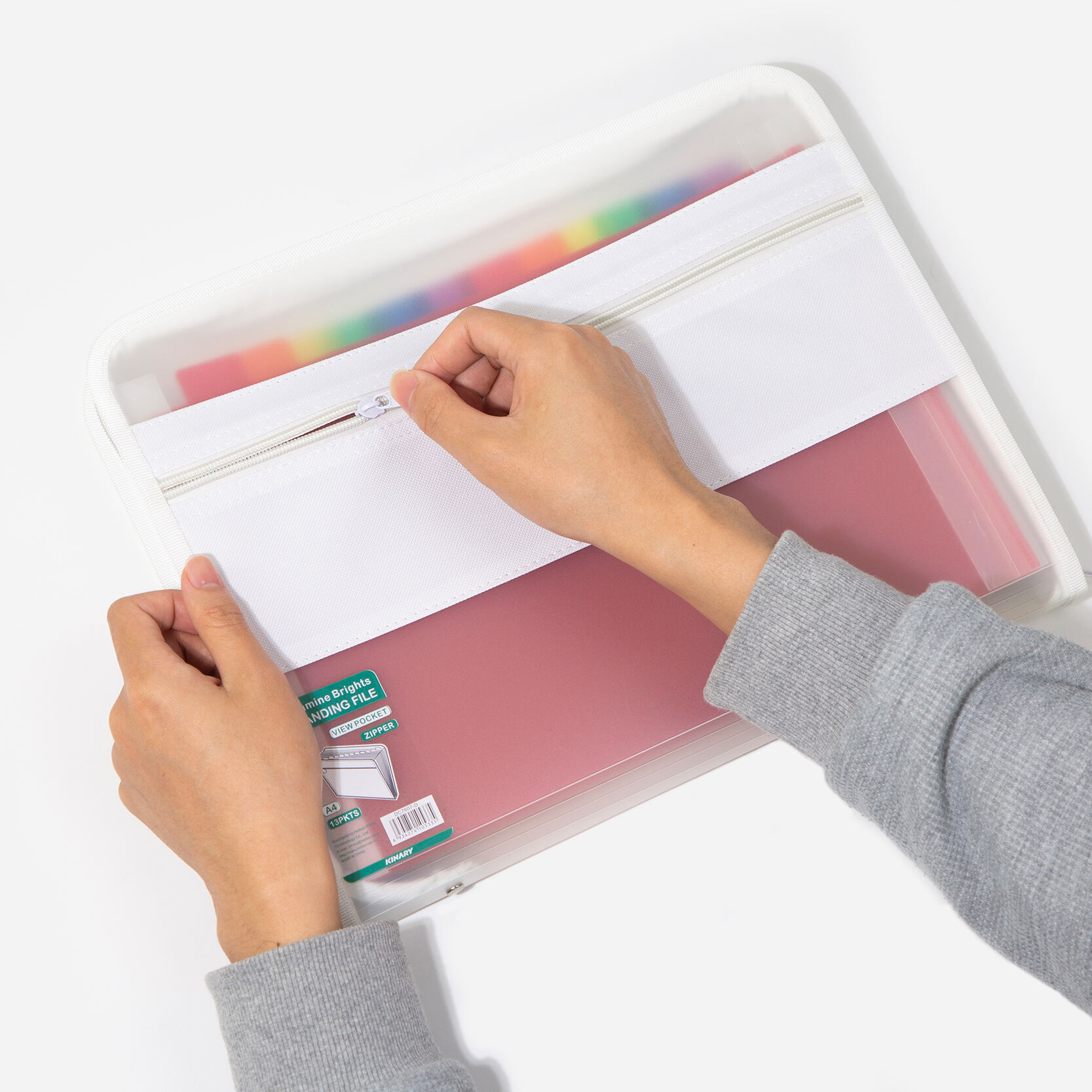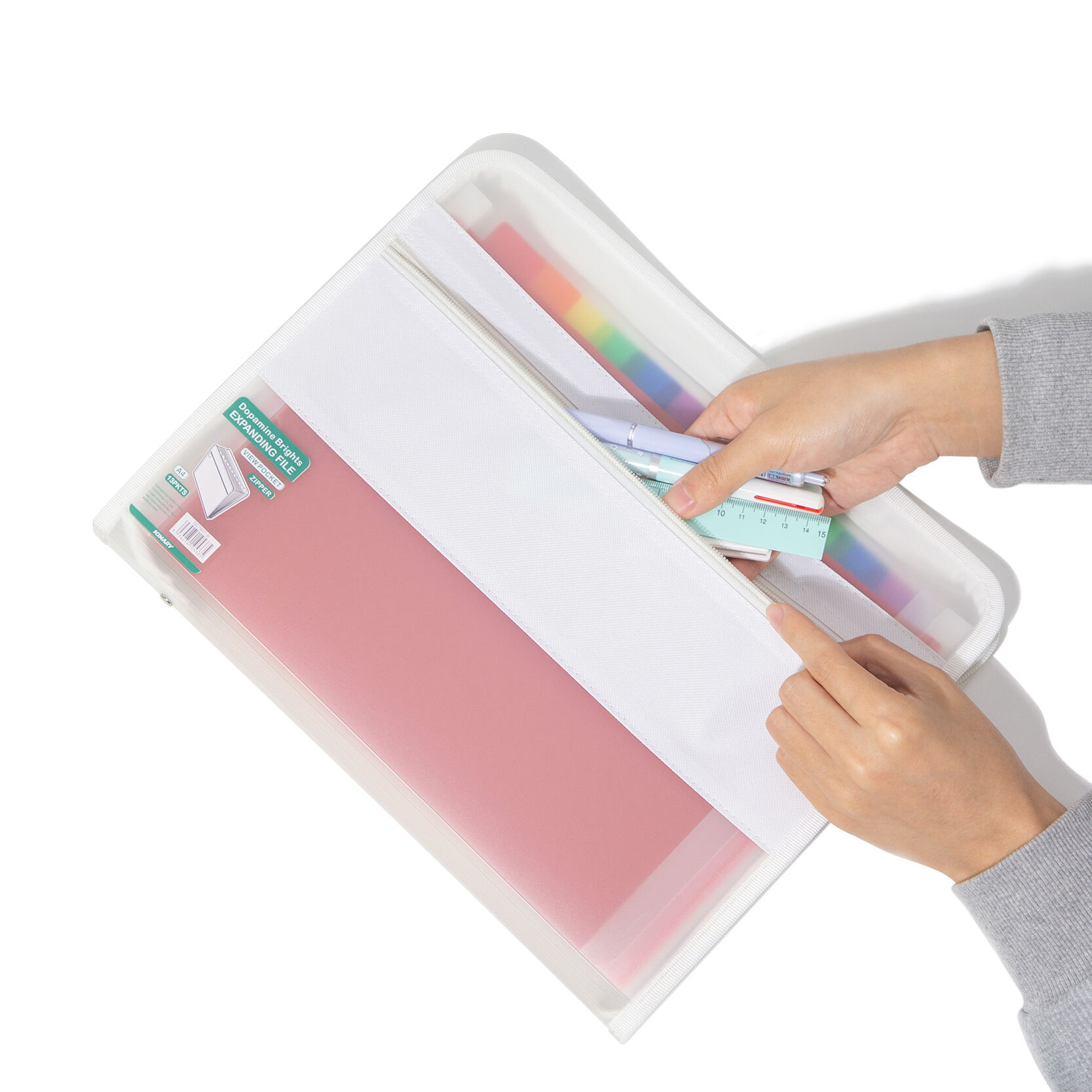 Berkas ekspansi A4 praktis yang dirancang dengan kantong dalam berindeks berwarna-warni, kantong pandang di bagian depan, serta penutup resleting guna menyimpan dokumen secara teratur dan aman.