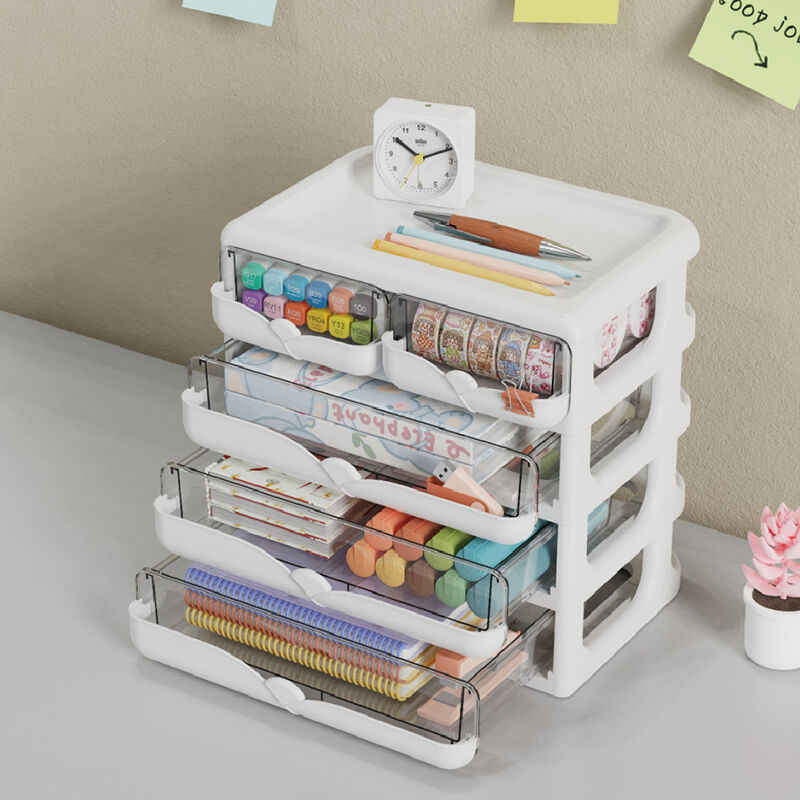 With multiple layer options, transparent drawers, and a raised top surface, it offers a practical storage solution for stationery, tapes, notes, and other daily desktop essentials.